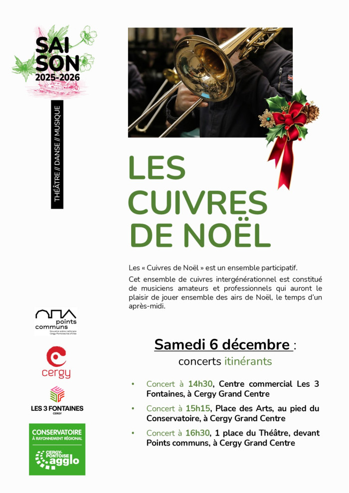 Que seraient les fêtes de fin d’année sans un concert des Cuivres de Noël du Conservatoire ? Airs traditionnels, standards intemporels connus de toutes et tous seront autant de billets pour prendre le chemin des fêtes…